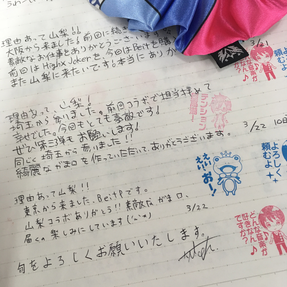 「アイドルマスター SideM×山梨」第2弾のご注文受付が終了して2カ月が経ち、ようやく少し落ち着いて、期間中に山梨を訪れたプロデューサーの皆さんが残してくださった〝思い出メモ〟をじっくりと読み返しています。